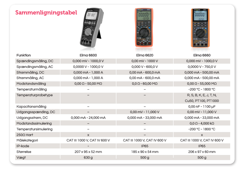 Elma 6660 er den avancerede model og udmærker sig ved også at kunne måle kapacitans og temperatur med type K-føler, PT100-føler samt mange andre probetyper, og har desuden øget nøjagtighed på alle måleparametre. På simuleringssiden tilføjer Elma 6660 modstand, temperatur og 250 Ω HART.